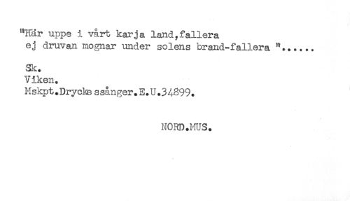 //// "Här uppe i vårt kar ja land, fallera //// ej druvan mognar under solens brand-fallera "..*... //// Sk* //// Viken. //// Mskpt.Drycke s sånger.E.U.3 4899. //// NORD.MUS. ////