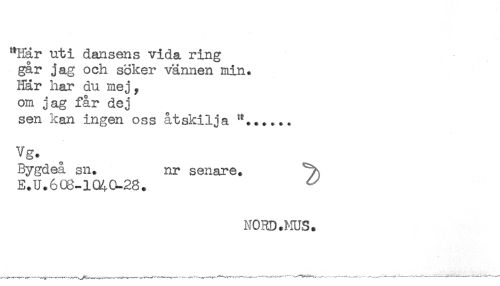 //// "Har uti dansens vida ring //// gar jag och söker vännen min. //// Här har du mej ? //// om jag får dej //// sen kan ingen oss åtskilja //// Bygdeå sn. nr senare. //// E.U.608-1040-28. ^ //// MORD.^iUS. ////