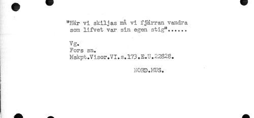 //// "Här vi skiljas nå vi fjärran vandra //// som lifvet var sin egen stig**.,.... //// Vg. //// Fors sn. //// Hskpt.Visor.VI.s.173.E.U.22828. //// NORD.MUS. ////