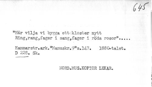 //// * //// "Här vilja vi bygga ettekloster nytt //// Ring,rangyfager i sang,fager i röda rosor"..... //// t //// Hammarstr.ark.^Ianuskr.9"s.l47. 1880-talet. //// D 228. Sk. //// NORD.MUS.KOPIOR LEKAR. //// E //// s //// ! //// ) //// r ////