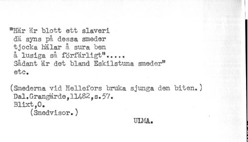 //// "Här är blott ett slaveri //// dä syns på dessa smeder //// tjocka hälar å sura ben //// å lusiga så förfärligt"..... //// Sådant är det bland Eskilstuna smeder*' //// etc. //// (Smederna vid Hellefors bruka sjunga den biten.) //// Dal.Grangärde,11A82,s * 57. //// Blixt,0. //// (Smedvisor.) ////