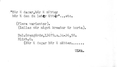 //// ."Här ä da?ar,har ä nätter //// här ä den du let$r ättqr'^..etc. //// (Flera varianter). //// (Lullas när något kreatur är borta). //// Dal.Qrangärde,13679.S.3A-36,58. //// Blixt.C. //// (Här ä dagar här ä nätter....... //// ULMA. ////