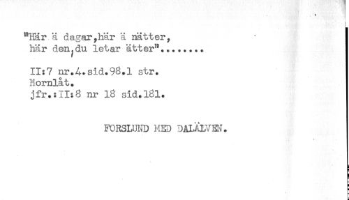 //// "Här ä dagar,här ä nätter^ //// här deiiy du letar ätter"........ //// 11:7 nr.4+sid.98.1 str. //// Hornlåt. //// jfr.:II:8 nr 18 sid.181. //// FORSLUND MED DALÄLVEN. //// * * 'i //// < ////