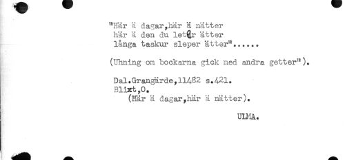 //// "Här ä dagar,här ä nätter //// här ä den du let&r ätter //// långa taskur sleper ätter"...... //// ; - //// (Ulming om bockarna gick med andra getter^). //// Dal.Grangärde,11482 s.42l. //// Blixt,0. //// (Här ä dagar,här ä nätter;. //// ULMA. ////