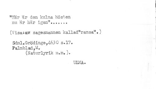 //// "Här är den kulna hösten //// nu är här igen '....... //// (Visa:av sagesmannen kallad"ramsa".) //// i //// Sdml.Grödinge,4630 s.17. //// Palmblad,J. //// (Naturlyrik m.m.). //// ULMA. //// * ////