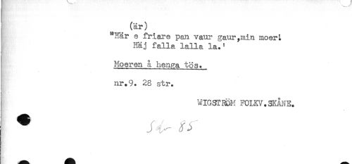 //// (är) //// "Här e friare pan vaur gaur,min moer^ //// Häj falla lalla la.' //// Möer en å hen{?a tös. //// nr.9. 28 str. //// g? ' //// 3P //// j WIGSTRÖM FOLIU/. SKÅNE. ////