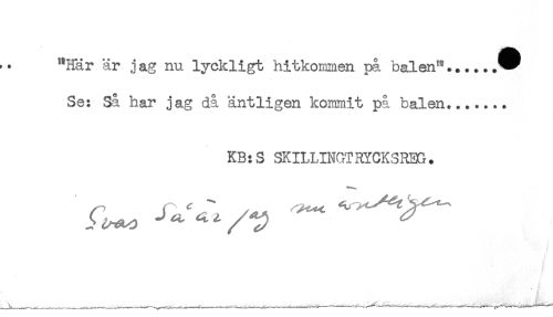//// "Här är jag nu lyckligt hitkommen på balen"......^ //// Se: Så har jag då äntligen kommit på balen....... //// KB:S SKILLINGTRYCKSREG. ////