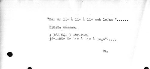 //// "Har är liv å liv å liv och lejan //// Finska mässan. //// Bi.' //// A 382:64. 3 str.kom. //// jfr.:Här är liv å liv å le^n^..... //// ^ RÄ. //// p ////