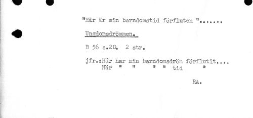//// ! //// ! "Har är min barndomstid förfluten //// Ungdomsdrörmnen. //// B //// n //// ! //// ) B 56 s.20. 2 str. //// jfr.;Här har min barndomsdröm förflutit.... //// Får " " " " tid " //// RA. ////