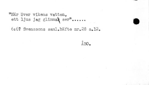//// "Här over vikens vatten, //// ett ljus jag glimma^ ser^...*,* ^ //// 6:6? Svenssons saml.häfte nr,28 s.12. //// ÅBO. //// : t ////
