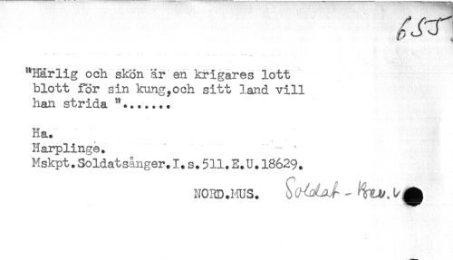 //// "Härlig och skön är en krigares lott //// blott för sin kung,och sitt land vill //// han strida //// Ha* //// Harplinge. - ^ //// Mskpt. Soldatsånger. 1. s. 511. E.U. 18629. //// NOUD.HUS. - ////
