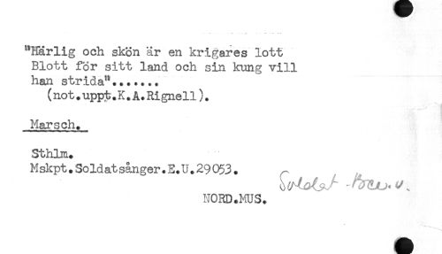 //// "Härlig och skön är en krigares lott //// Blott för sitt land och sin kung vill //// han strida".....,. //// (not.uppt.K.A.Rignell). //// Marsch. //// Sthlm. //// Mskpt.Soldatsånger.E.U.29053. //// NORD.MUS. ////