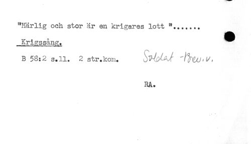 //// "Härlig och stor är en krigares lott //// Krigssång. ^ //// B 58:2 s.ll. 2 str.kom. JT^A^ //// RA. ////