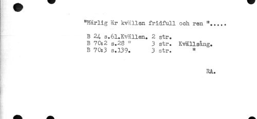 //// "Härlig är kvällen fridfull och ren "..... //// B 24. s.6l.Kvällen. 2 str. //// B 70:2 s.28 " 3 str. Kvällsång. //// B 70:3 s.139. 3 str. " //// RA. ////