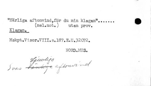 //// < //// ! //// "Härliga aftonvind,for du min klagan"....... ^ //// (mel.not.) utan prov. //// Klagan. ' //// Mskpt.Visor.VIII.s.lÖ7.E.U.32 072. //// N03D.MUS. //// i //// /V ^^rrr^ ////
