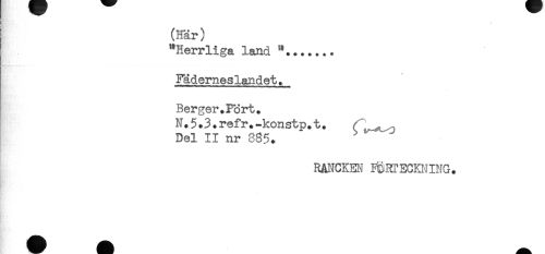 //// (Här) //// "Herrliga land "....... //// Fäderneslandet. //// Berger.Fört. //// N.5.3.refr.-konstp.t. (l^uo //// Del II nr 885. //// RANCKEN HaHTECKNING. ////