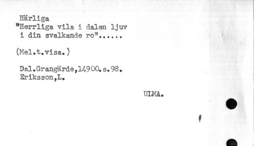 //// t //// Härliga //// "Herrliga vila i dalen ljuv //// i din svalkande rc^...... //// (Mel.t.visa.) //// Dal.Grangärde ?149 00.s. 98 . //// Eriksson,L. //// uim. ^ //// f ////