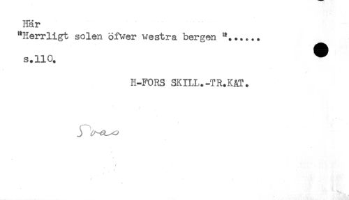 //// Här //// "Herrligt solen öfwer westra bergen ...... //// s.110. ^ //// H-FORS SKILL.-TR.Km*. //// * //// t ' ////
