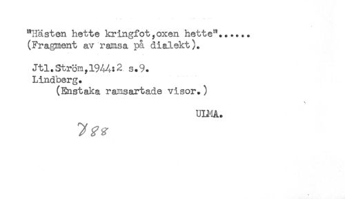 //// "Hästen hette kringfot,oxen hette^...... //// (Fragment av ramsa, pa dialekt). //// Jtl.3trömyl944:2 s.9. //// Lindberg. //// (Enstaka ramsartade visor.) //// \ //// ULHA. ////
