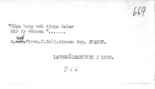 //// "HÖga berg och djupa dalar //// bär är vännen ...... //// m.^^Fören.f.Sm^l.minnen dep. SVAKGP. //// i //// MNDS-IåLSÅRKIVEr I LUND. //// } ////