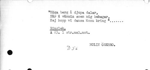 //// "Höga berg å djupa dalar. //// Här ä vännin soem mig behagar, //// Hej hopp vi dansa ännu kring **....... //// * //// Ringlek. //// A 23. 1 str.mel.not. //// - //// ! . //// - //// MOLIN ÖREBRO. //// 2) //// } ^^ ////