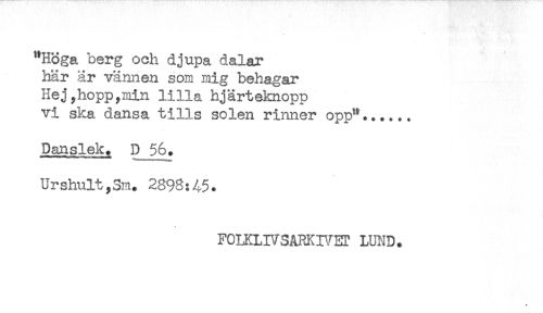 //// "Höga berg och djupa dalar //// här är vännen som mig behagar //// Hejyhoppymin lilla hjärteknopp //// vi ska dansa tills solen rinner opp**...... //// Danslek, p 56. //// Urshult,3m. 2898:45. //// FOmLIVSARKIVET LUND. ////