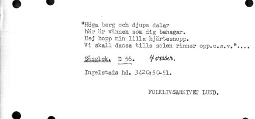 //// "Höga berg och djupa dalar //// här är vännen som dig behagar. //// Hej hopp min lilla hjärtesnopp. //// Vi skall dansa tills solen rinner opp.o.s.v.".... //// Sånglek. DJ>6. //// Ingelstads hd. 34^0:50-51. //// FOIKLIVS&RKIVEr LIRm. ////