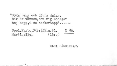 //// "Höga berg och djupa dalar, //// här är vännen,som mig behagar //// hej hopp,i en sockertopp"...... //// Uppl. Harbo, 3 03: %2. s. 31. D 56. //// Martinelle. (l6:o) — //// ULMA SÅNGLEr^AR. ////