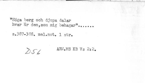//// ^Höga berg och djupa dalar //// hvar är den,som mig behagar**....... //// s.387-338. mel.not. 1 str. //// Jh , ÅHM.MS KB Vs 2:2. ////