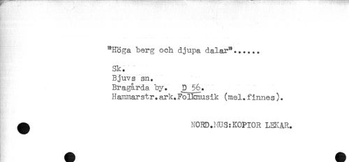 //// "Höga berg och djupa dalar"...... //// Sk."....... //// Bjuvs sn. //// Bragårda by. 0 56. //// Hammarstr. ark. Folkmusik (mel. finnes). //// ^ N0RD.HU3:KOPIOR LEKAR. ////