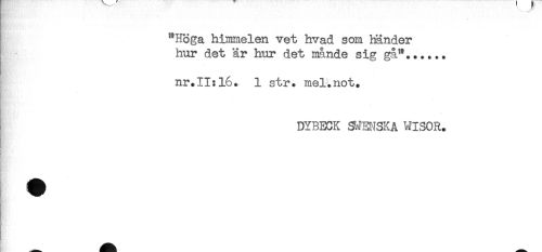 //// "Höga himmelen vet hvad som händer //// } hur det är hur det månde sig gå"...... //// nr.II:16. 1 str. mel.not. //// DYBECK SMENSKA MISOR. //// K //// y ////