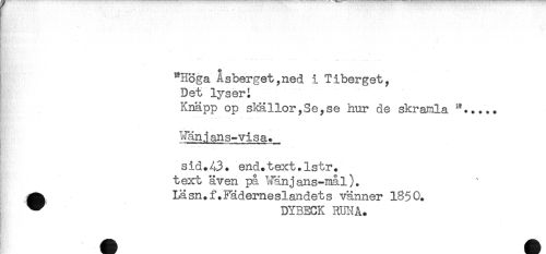//// "Höga Åsberget,ned i Tiberget, //// Det lyseri //// Knäpp op shnllorySe,se hur de skramla //// W;'.'. ..... ......" ' ' -..... //// ^länjans-visa. , //// sid.43. end.text.lstr. //// text även på ^fänj ans-mål). //// ^ Iäsn.f.Fäderneslandets vänner 1850. //// ^ DYBECK RUi^Ä. ////