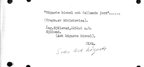 //// ^Högaste himmel och fallande jord"...... //// (fragm.av kärleksvisa). //// Ang.Själevad,2252:6 s.9. //// Sjölund. //// (Ack högaste himmel). //// ULMA. ////