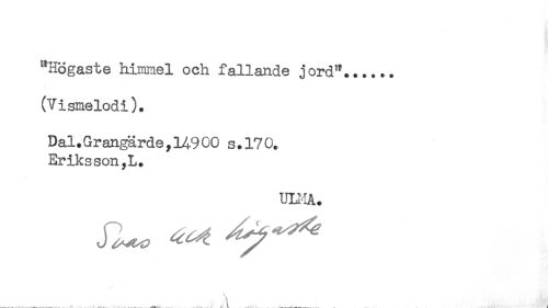 //// **H3gaste himmel och fallande jord"...... //// (Vismelodi). //// Dal.Grangärde,14-900 s.170. //// Eriksson,!,. //// ULMA. ////