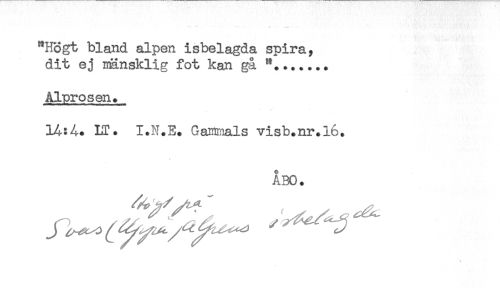//// "Högt bland alpen isbelagda spira, //// dit ej mänsklig fot kan gå "....... //// Alprosen. //// 14:4. M?. I.N.E. Gamrnals visb.nr.lö. //// ÅBO. ////