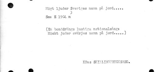 //// ^^ Hofrt ljuder Sveriges nar(nn på jord..... //// 3 //// Se: E 1904 m //// * //// (En bonddrängs lustiga nationalsång: //// Hbckt juder svärjes nainn på jord.....) //// KB:s SKIIUNGTRYCKSrtm. //// t ////