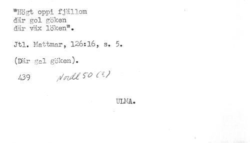 //// "Högt oppi f jällom //// där gol göken //// där väx löken". //// Jtl. Mattmary 126:16, s. 5. //// (Där gal göken). //// A39 //// UU-IA. ////