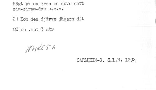 //// * " .r-*-' tr< - ' ---- //// sim-siram-dam o.s.v. //// 2) Kom den djärve jägarn dit ^ //// 82 mel.not 3 str //// CÅRL.UED4-G. S.L.M. 1892 ////
