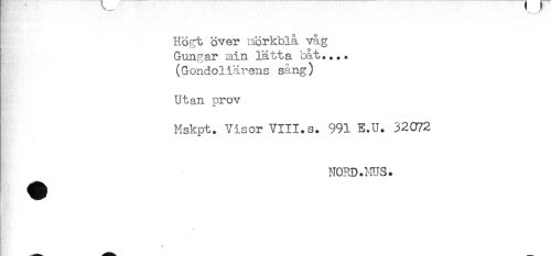 //// Högt över mörkblå våg //// Gunnar min lätta båt.... //// (Gondoliärens sång) //// Utan prov //// Mskpt. Visor VIII.s. 991 E.U. 32072 //// NORD.HUS. //// - ////