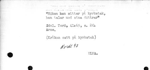 //// -.'.-*' .....?-. --f ; '. *'' .T.: . — ........-......* *** ' * - - *"* *-. //// ^ ^ ^ —f* - ' —- ^ . -.v. - --—. ^ //// ^Höken han. sitter på kyrketal-:, //// han talar med sina döttrar^ //// Sdml. Torg, 41:6$, s. 20. //// Arne. //// (Kråkan satt på k^rrketak) //// ^ UUJÅ. ////