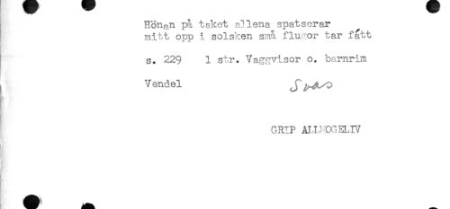//// Hönan på taket allena spatserar //// mitt opp i solsken små flugor tar fatt //// s. 229 1 str. Vaggvisor o. barnrim //// Vendel J^^-^O //// GRIP M.LMOGELIV //// . ////