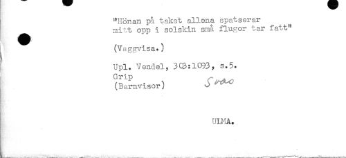 //// ! ^Honan på taket allena spatserar //// mitt opp i solskin små flugor tar fa.W //// (Vaggvisa.) //// s //// ^ Upl. Vendel , 3Q3:1C93, s.5. //// Grip ^ . //// (Barnvisor) J ^ ^ //// ^ - //// ULMA. //// t //// ^ . . - ////