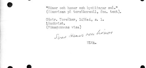 //// "Hönor och hanar och kycklingar små." //// (Honsvisan på torsåkersrnål, fon. text). //// Gästr. Torsaker^ 1456:4? s. 1. //// Lindkvist. //// (Hönsgunmans visa) //// UIJ'!A. ////