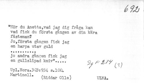 //// "Hor du Anetta,vad jag dig fråga kan //// vad fick du första .gången av din kära //// fasteman? //// Jo,första gången fick jag //// en harpa utav gnid //// jo andra gången fick jag //// en gullslipad kniv**..... ^ ^ ^ ^ ^ //// Upl.Nora*3Q3:934 s.100. //// Martinell* /^.-n n //// (Riddar Olle) ULMA. ////