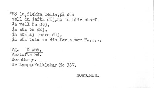 //// "Ho lu,flekka lella,på ål: } //// vell du jefta däj,no lu blir stor? //// Ja vell ha dej, //// ja ska ta däj, //// ja ska äj bedra däj, //// ja ska tala ve din far o mor ..... //// Vg. D 269. //// V art ofta hd/ //// Korsbärga. //// Ur Lampa: Folklekar No 387. ////