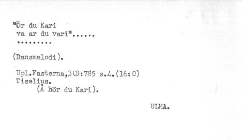 //// *Cr du Kari //// va ar du vari"...... //// (Dansmelodi). //// Upl.Fastema,303:785 s.A.(l6:0) //// Tiselius. //// (Å hör du Kari). //// UIMA. ////