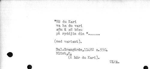//// "Hö du Kari //// va ha du vari //// s8m ä s8 b8su //// på ryddjin din .. //// (med vai^iant). //// Dal.Grangärde,11482 s.590. //// ^ Blixt,0. //// ^ (A hör du Kari). ////