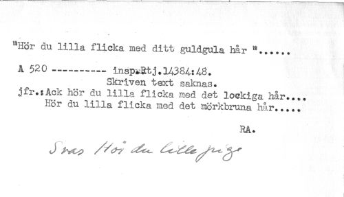 //// "Hör du lilla flicka med ditt guldgula hår "...... //// * f. //// A 520 ..........insp^Rtj.14384:48. //// Skriven text saknas, //// jfr.;Ack hör du lilla flicka med det lockiga hår.... //// Hör du lilla flicka med det mörkbruna hår.....* //// RA. ////