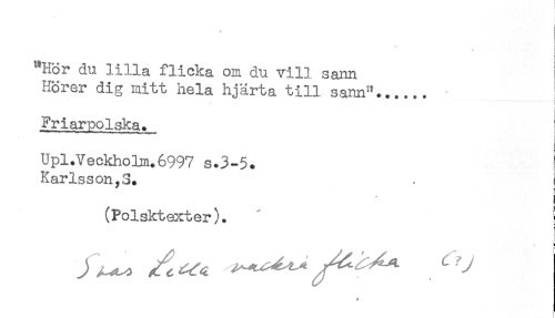 //// "Hör du lilla flicka om du vill sann //// Hörer dig mitt hela hjärta till sann"...... //// Friarpolska. //// I //// Upl.Veckholm.6997 s.3-5. //// Karlsson,S. //// ^ C //// (Polsktexter). ' ! //// < ////