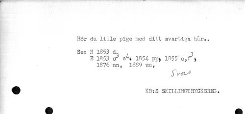 //// Hör du lille pige med ditt svartiga hår.. //// Se: N 1653 d o //// E 1853 s^ c^^ 1854 pp^ 1855 a,f; //// 1876 nn, 1889 uu, //// ^ KB:S SKIHINGTHYCKSHEG. ////